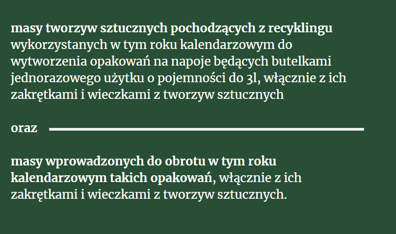 Przepis mówi wprost, że wprowadzający produkty w opakowaniach na napoje będących butelkami jednorazowego użytku z tworzyw sztucznych o pojemności do 3l ma obowiązek zagwarantowania by opakowania te, włącznie z ich zakrętkami i wieczkami z tworzyw sztucznych, zawierały udział wagowy wynoszący co najmniej: